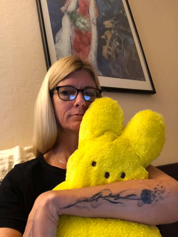 The night we came home from the hospital, I needed something to hold of hers. I found this guy and grabbed him and he’s been living on my bed ever since. I hug him because I can’t hug her, and, early on, I couldn’t leave the house without the yellow Peep. Talia understands the significance I’ve put on it too. Every night she comes to say goodnight to me and hugs the Peep saying, “Goodnight, Izzy. I love you!”